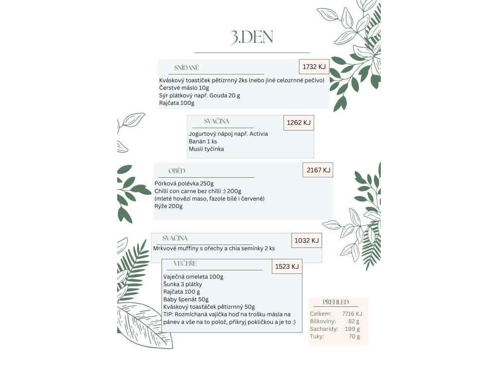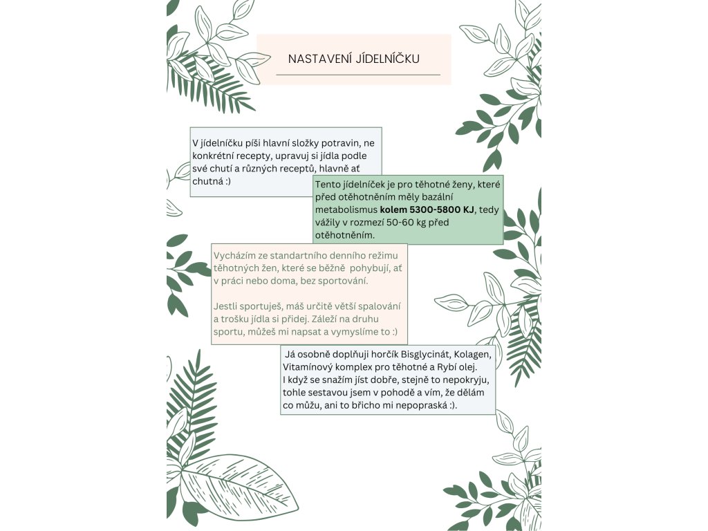 Náš jídelníček tě naučí, jak intuitivně vybírat potraviny, správně dávkovat porce a rozložit živiny. Snažíme se odstranit zmatky kolem těhotenské stravy a poskytnout jasné informace, aby těhotné ženy měly jistotu, že jedí správně. Naše materiály obsahují také přehled o doporučeném denním příjmu vitamínů a minerálů pro těhotné ženy, včetně informací o doplňcích stravy.
